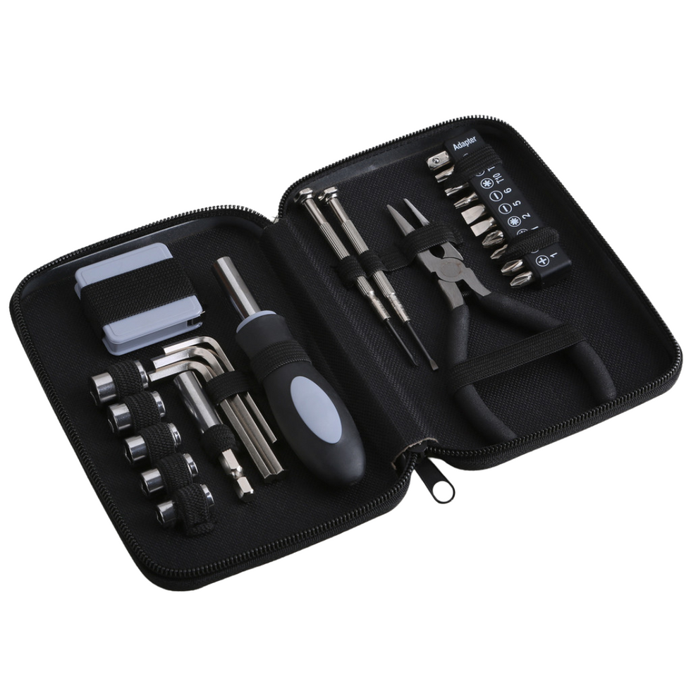 - Includes 10 bits, 5 sockets, 3 hex keys, 2 screwdrivers, an extension, a bit holder, pliers, and a tape measure